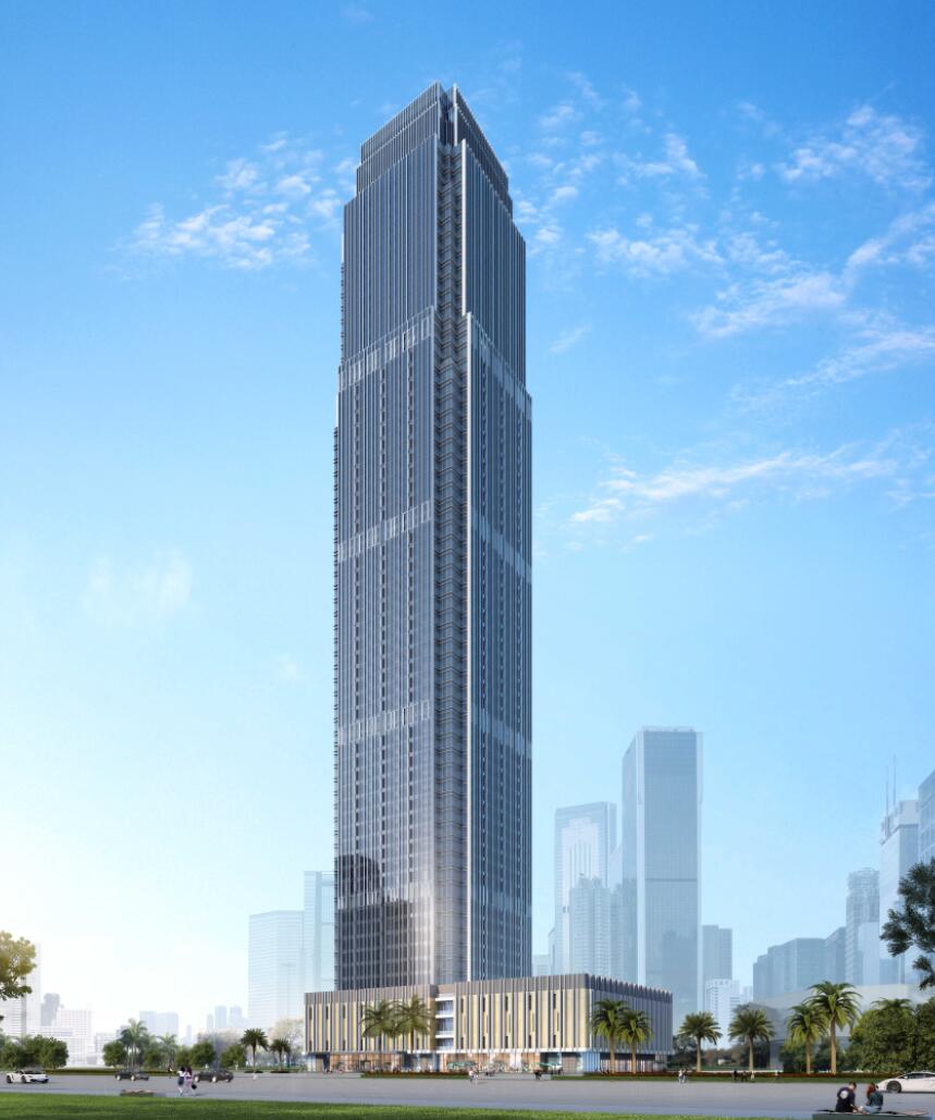 項目位于防城港市江山大道與金花茶大道交匯處,是一棟大型商業、辦公、酒店綜合體,總建筑面積超過17萬㎡,建筑高度達到271米,地上70層,是防城港市最高樓。
